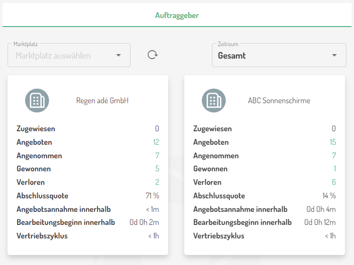 Der Report besteht aus einer Kachelübersicht der auftraggebenden Partner-Firmen mit den entsprechenden Kennzahlen (siehe Abschnitt "Kennzahlen des Auftraggeber-Reports") und der darüber befindlichen Filterleiste, welche eine Filterung auf einen oder mehrere Marktplätze und die Einschränkung auf den gewünschten Betrachtungszeitraum ermöglicht (siehe Abschnitt "Filtermöglichkeiten des Auftraggeber-Reports").