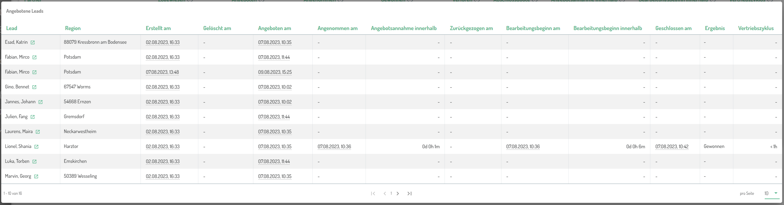 Beispielansicht "Angebotene Leads" zu Beginn des Vertriebsprozesses: