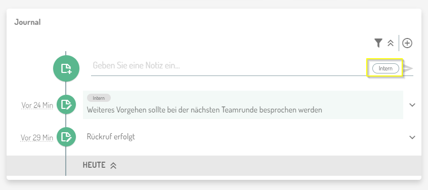 Im Journal werden interne Notizen im Gegensatz zu normalen Notizen mit einem hell-grünen Hintergrund und einem kleinen Chip mit dem Schriftzug "Intern" in der linken oberen Ecke angezeigt.