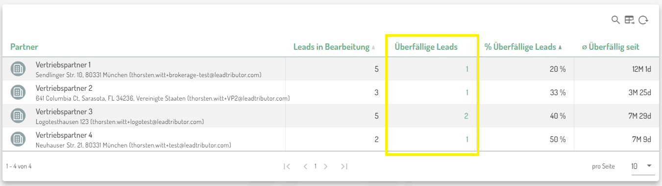 Zur besseren Einordnung zeigen wir Ihnen neben der Anzahl überfälliger Leads auch die Anzahl aller Leads, die sich aktuell in Bearbeitung (d.h. ohne Ergebnis) bei dem jeweiligen Vertriebspartner befinden. Außerdem geben wir Ihnen die mittlere Überfälligkeitszeit aller aktuell überfälligen Leads aus.