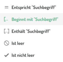 Neben dem Namen und der Emailadresse des Vertriebspartners, kann zusätzlich nach den in den Vertriebspartnereinstellungen konfigurierten Attributen gefiltert werden. Es handelt sich bei sämtlichen angebotenen Filtern um Textfilter mit den bekannten Suchkriterien: