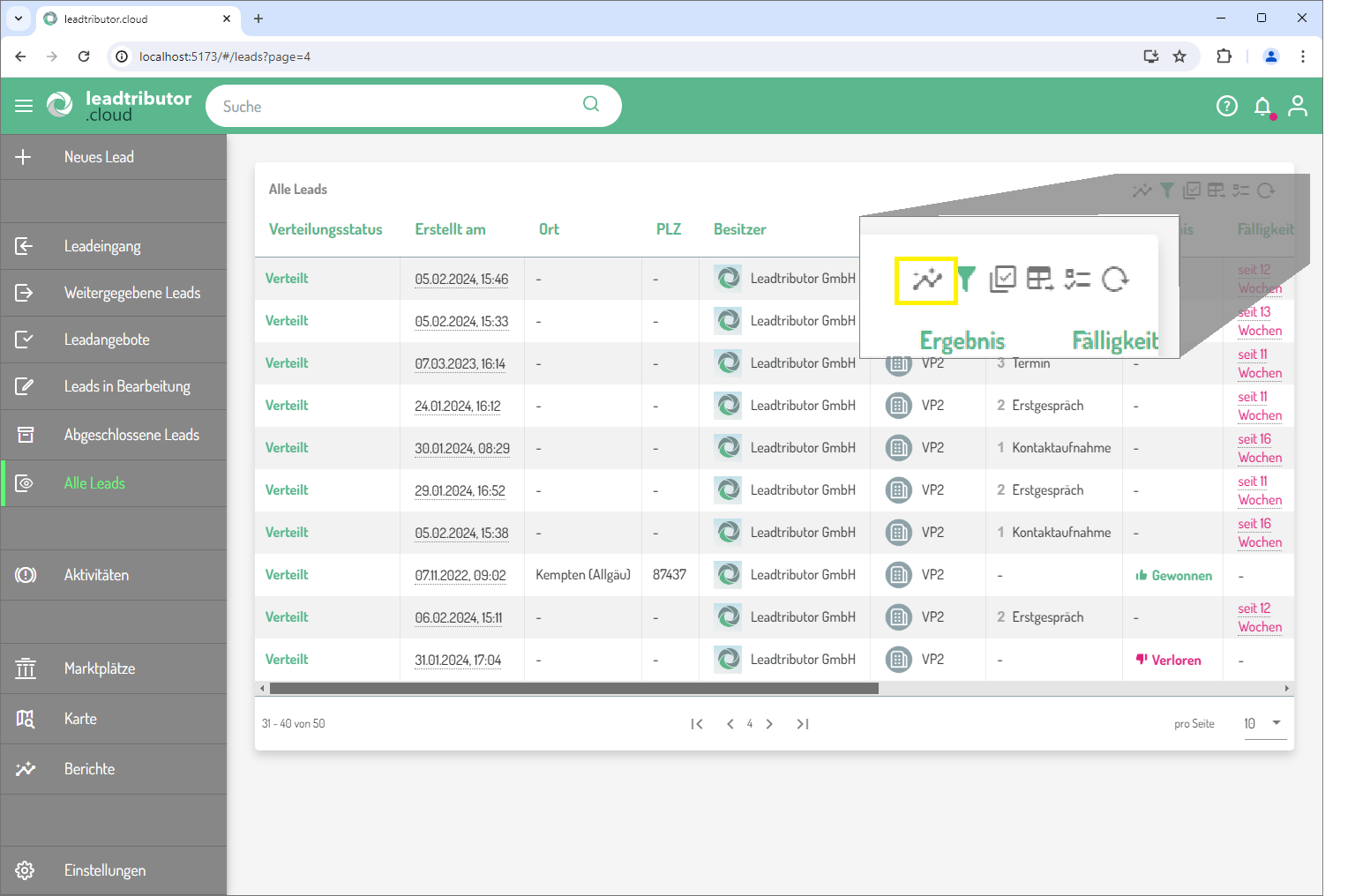 Die in einem Funnel berücksichtigten Daten sind also ggf. nur eine Untermenge der in der jeweiligen Leadliste angezeigten Leads, da in den Leadlisten Leads mit unterschiedlichen Vertriebsprozessen enthalten sein können. Für den Funnel relevant sind darüber hinaus nur Leads mit den Verteilungsstatus Verteilt, Zugewiesen oder Intern.
