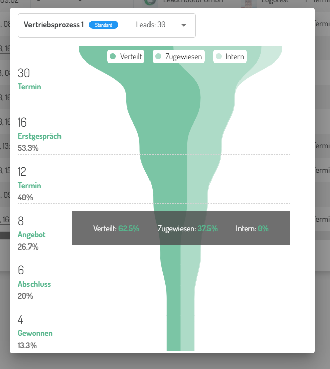 Für jede Phase wird auf der vertikalen Achse die insgesamte Anzahl von Leads, der Name der Phase und der prozentuale Anteil an der Grundmenge angezeigt (also aller Leads des aktuellen Filterergebnisses, die dem Vertriebsprozess zugeordnet sind). Fährt man mit der Maus über die einzelnen Balken des Funnels, werden die prozentualen Anteile der Leads an den Verteilungsstatus eingeblendet.