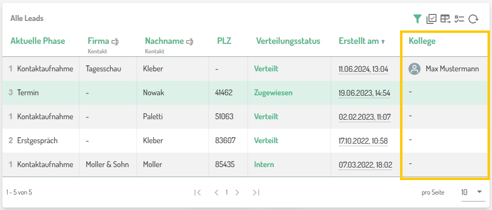 Den zugewiesenen Kollegen können Sie sich ebenfalls auf allen Leadlisten anzeigen lassen.