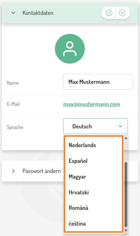Die gewählte Sprache wirkt sich auf die gesamte Anwendung inkl. E-Mail-Benachrichtigungen aus.