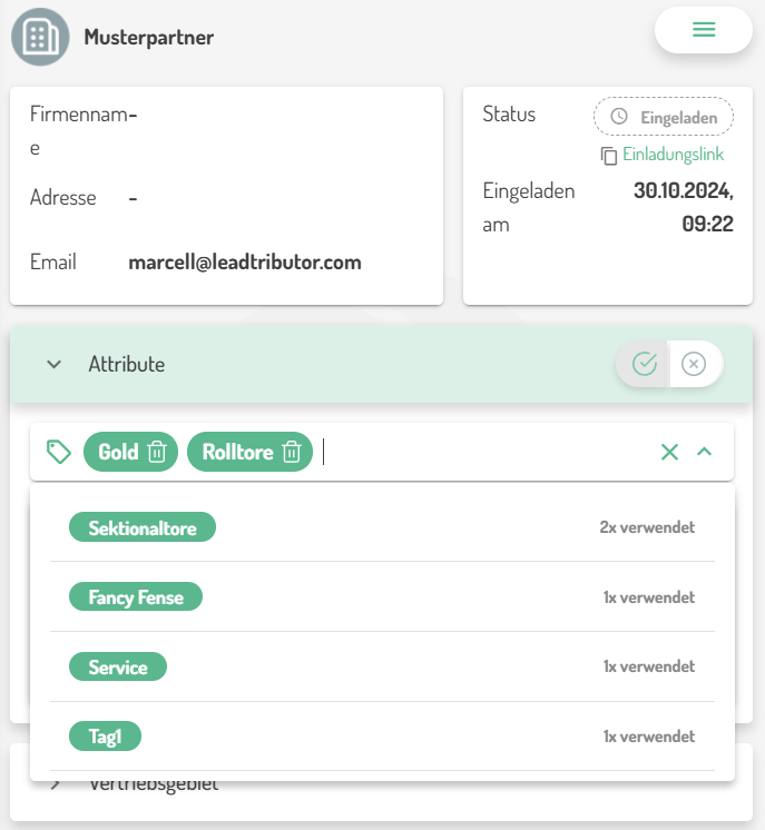 Ihnen wird dabei jeweils eine Liste von bereits an Partner vergebenen Tags angezeigt, inkl. eines Hinweises bei wievielen aktiven/eingeladenen Partnern dieses Tag bereits verwendet wird.