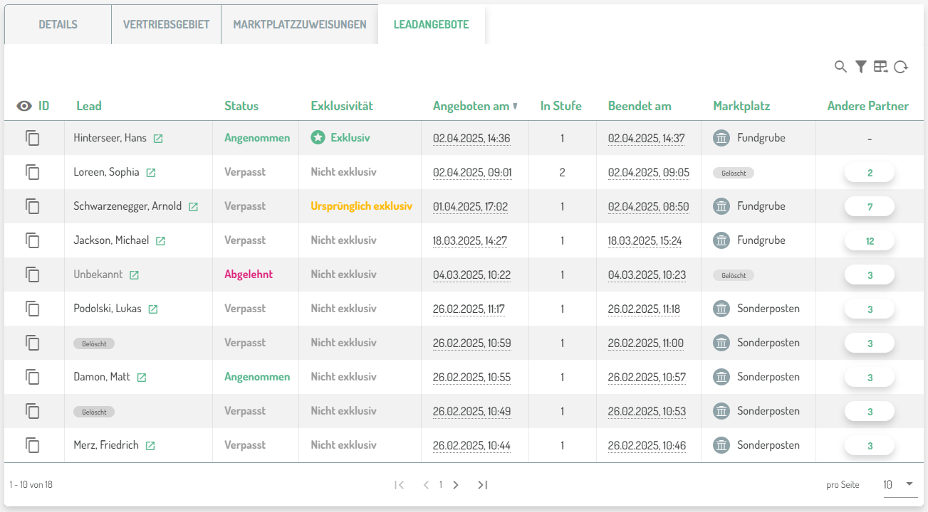 Auf der Vertriebspartner-Detailseite wurde ein neuer Tab Leadangebote hinzugefügt. Der Tab zeigt eine Liste, welche sämtliche Leadangebote, die dem entsprechenden Partner jemals über einen Ihrer Marktplätze angeboten wurden, anzeigt und durchsuchbar macht: