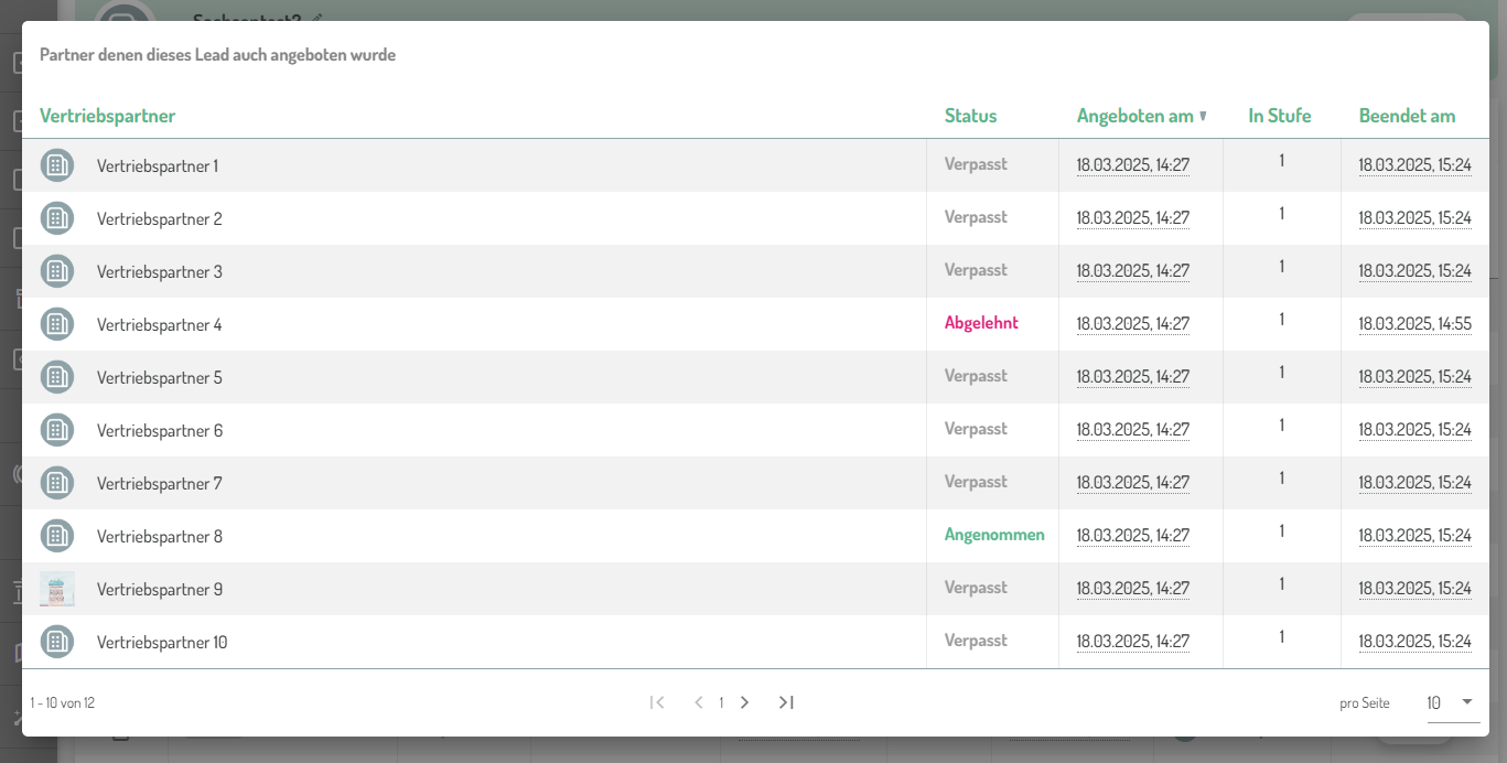Ein Klick auf den Button in der Spalte "Andere Partner" öffnet ein Popup mit einer weiteren Liste, welche jene Vertriebspartner auflistet, die im selben Verteilungsvorgang ebenfalls das Lead angeboten bekommen haben.