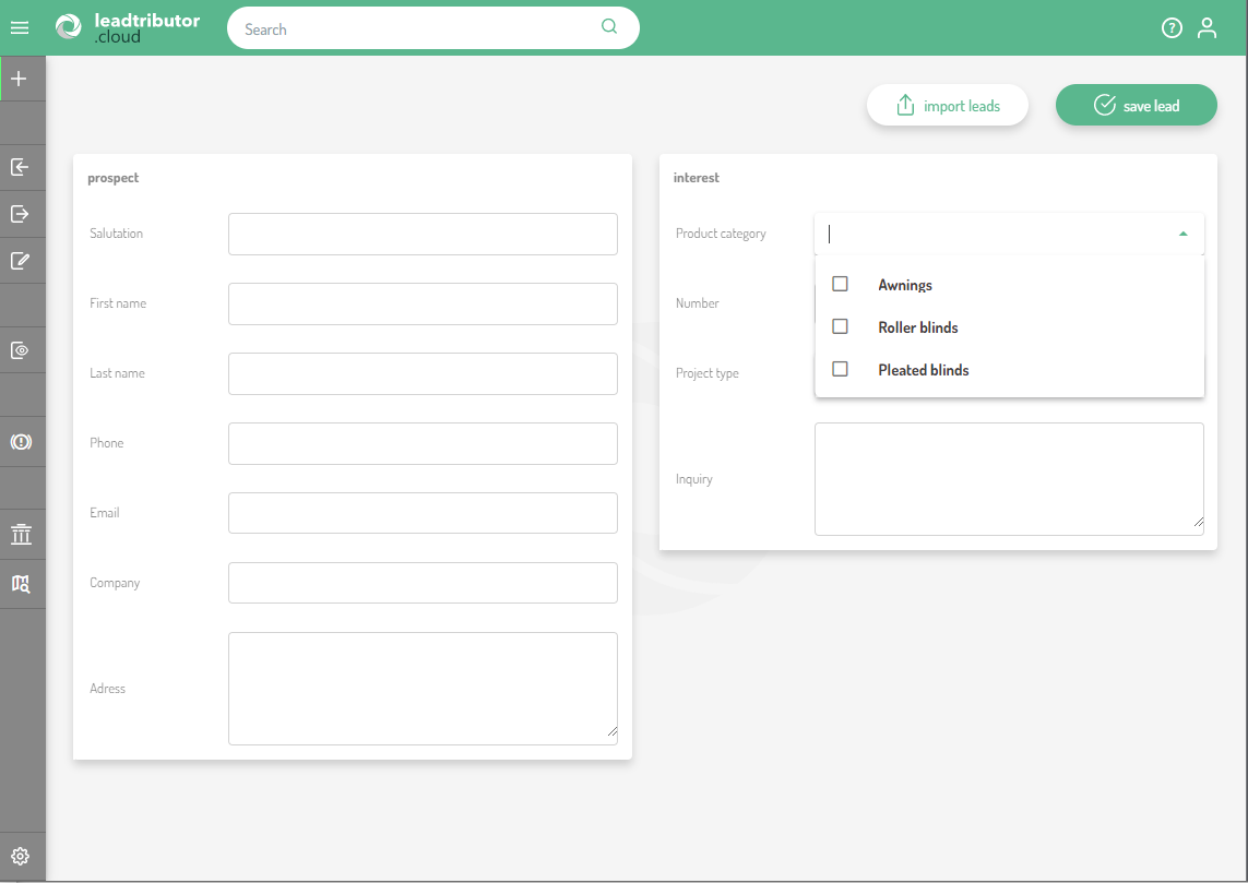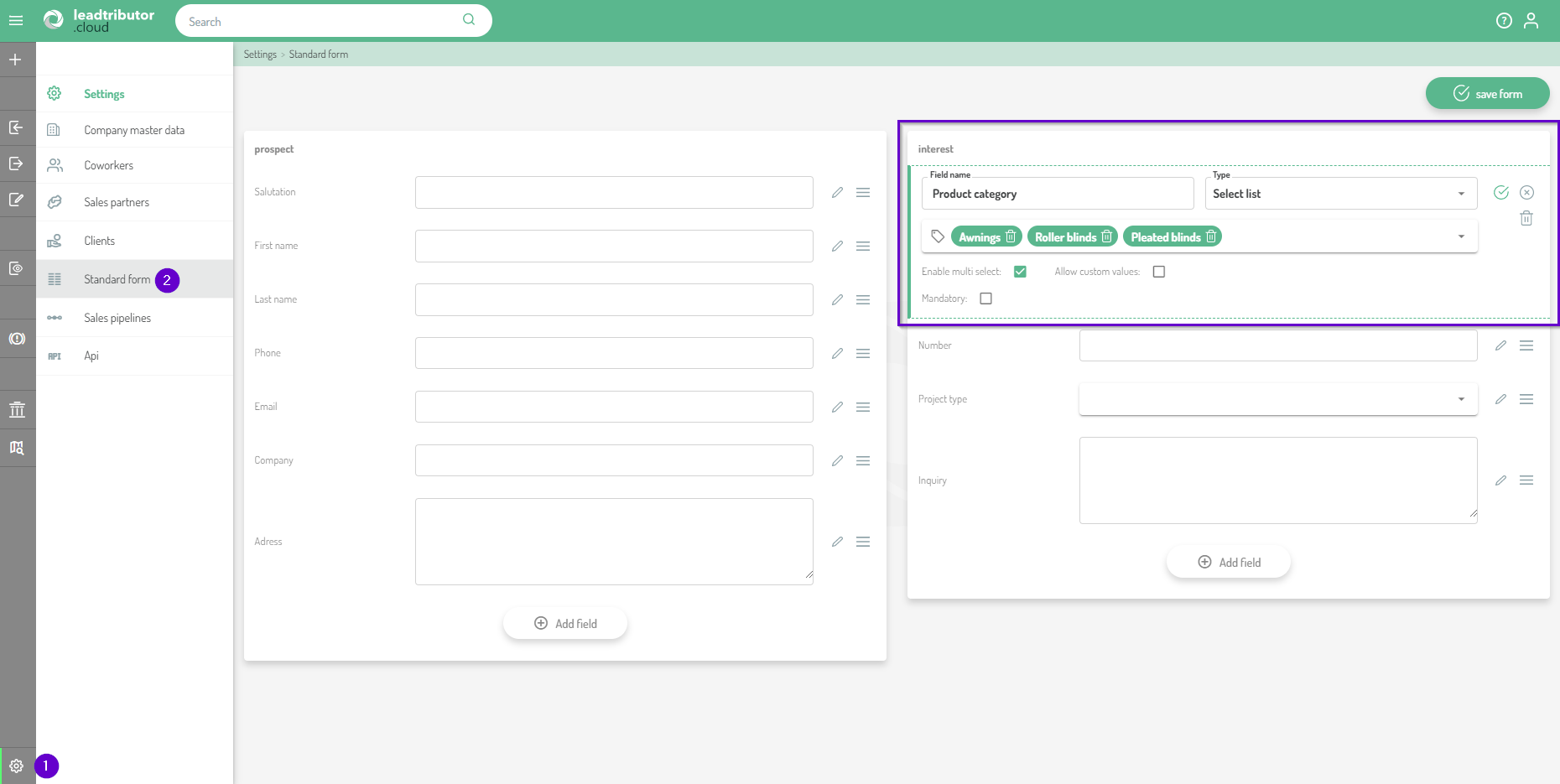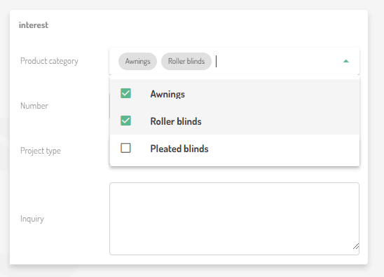 As from now on, the new form field select list can be set in our lead form. This makes it possible to store lists of values in a field of a lead. A simple example could be the field product category, in which the product categories relevant to the manufacturer are entered, such as "awnings, roller blinds, pleated blinds", if the customer is a manufacturer of shading solutions: