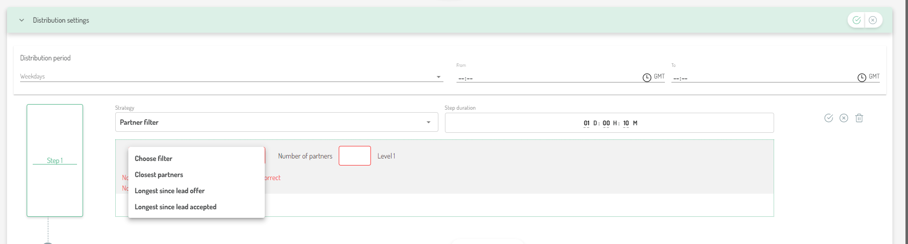 - For the distribution strategy partner filter, in addition to the distribution to nearest partners, the two filter options Longest since lead offer and Longest since lead accepted are now also available.